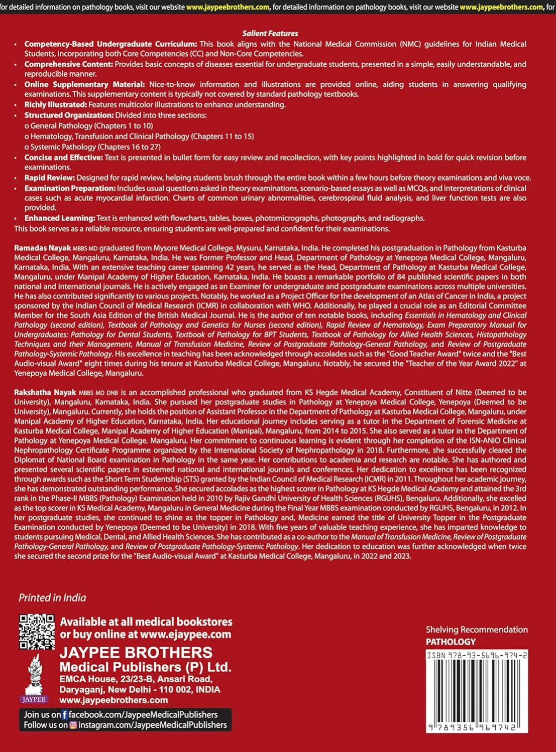 Exam Preparatory Manual for Undergraduates: Pathology (5th Edition) by Ramadas Nayak is a highly popular, exam-oriented textbook for 2nd-year MBBS students, fully updated to align with the NMC Competency-Based curriculum. Designed specifically for rapid revision, it simplifies complex pathology concepts into concise, bulleted points with bold keywords, making it much easier to recall answers during theory and viva exams. The book is packed with high-quality flowcharts, gross images, and photomicrographs for visual learning, and it also covers practical essentials like clinical case scenarios and urine/CSF analysis interpretation in a single, comprehensive volume.